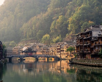 Прогуляемся по улицам и продолжим путешествие. Нас уже ждёт древний город Фэнхуан, спрятанный от непогоды и бурь посреди гор. Мы побываем на набережной и отведаем местную халву — её отбивают молотками прямо на улицах. Любители танцев, баров и караоке смогут пройтись по заведениям городка. Но помните, шум и веселье прекращается здесь ровно в 23:00.