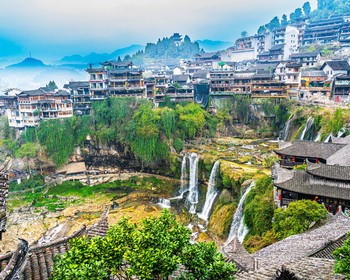 Утром займём места в заказном автобусе и поедем в город Фуронг, построенный на водопаде. Виды здесь впечатляют: классические китайские домики с пагодами располагаются прямо на краю пропасти, куда срываются водные потоки.