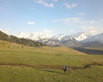 Сегодня нас ждёт долина Джергалан. Зимой сюда съезжаются любители фрирайдинга, а летом — приверженцы кумысолечения. Заселимся в юрточный лагерь с невероятными видами вокруг, после чего прогуляемся к водопаду Кок бель или озеру Туралуу Коль. А ещё в долине мы покатаемся верхом!