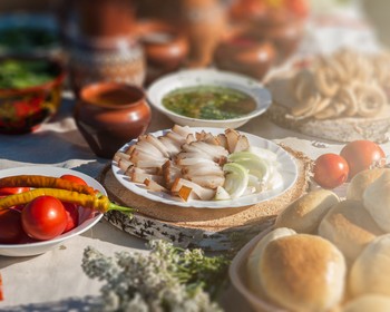 На обед отправимся в село Парское, славящееся своими калачами. Нас встретит радушная хозяйка и проводит в русскую избу с печью и накрытым столом из 12 блюд! Узнаем историю яств и всё продегустируем: кутью, взвар, постные блины, винегрет, борщ с грибными ушками, тушёного гуся с квашеной капустой, постные голубцы, свинину с хреном, холодец, ржаной пирог с рыбой, медовый пряник и имбирный пирог. Взрослым будет предложено по 50 мл местного алкогольного напитка.
