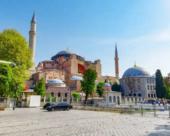 Далее — внешний осмотр Айя-Софии, легендарного византийского храма, с обсуждением его сложной и насыщенной истории.
