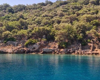 Прибудем в бухту Гёккая. Она расположена неподалёку от замка Симена, между городами Каш и Демре, рядом с рыбацкой деревней Учаыз и древними ликийскими руинами затонувшего города Кекова.